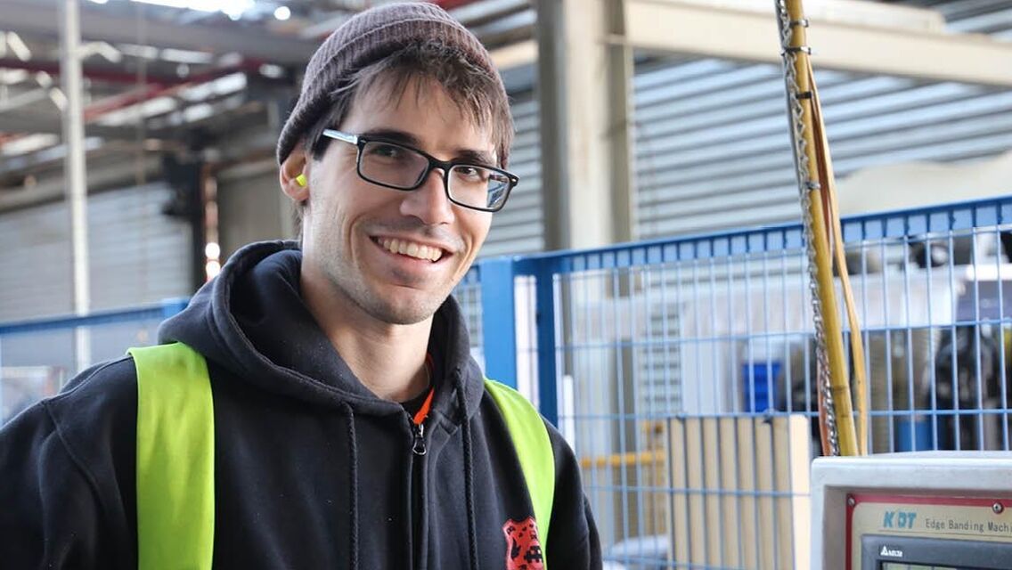 As a supported employee, Russell takes pride in operating the beam saw and cutting and creating the components of a two-door cupboard.